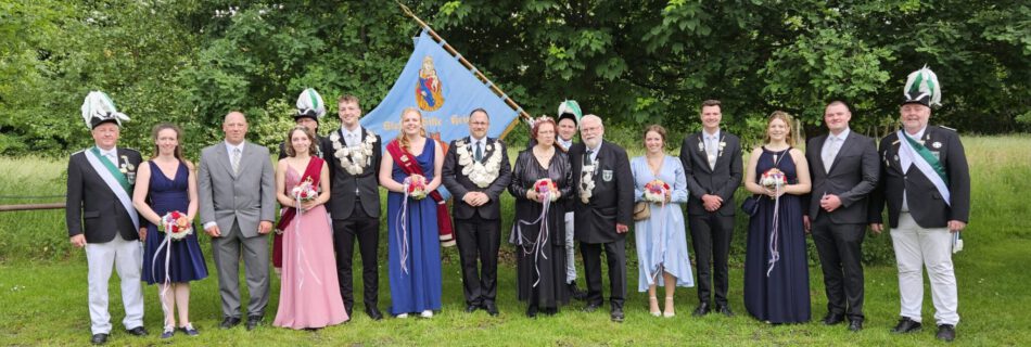 von links: Königsoffizier Manni Henke, Prinzgemahlin Candy Röttger, Prinzgemahl Jens Neuhaus, Prinzessin Wolkje Lenz, Schriftführer Robert Schicht, Prinz Sebastian Hotho, Königin Carolin Hugemann, König Philipp Röttger, Kaiserin Ute Kröger, Fahnenoffizier …