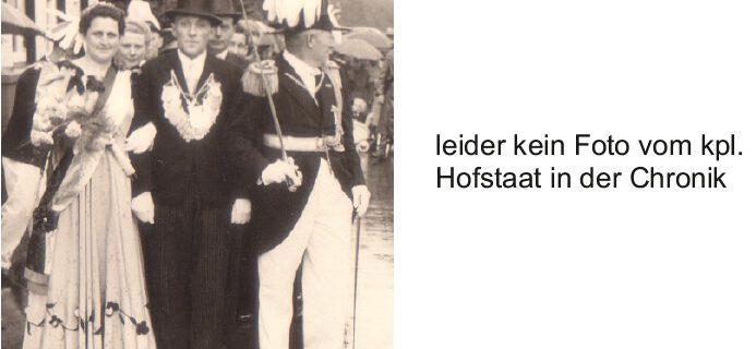 von links nach rechts: Maria Eggert (Vorjahreskönigin), Paul Bischoff Everding (Vorjahreskönig), Theresia Marx, August Pietig, Otto Henrichmann (Prinz 1958), Königin Maria Lohmann, König Theo Marx, Ferdinand Henrichmann (König 1958), Prinzessin …