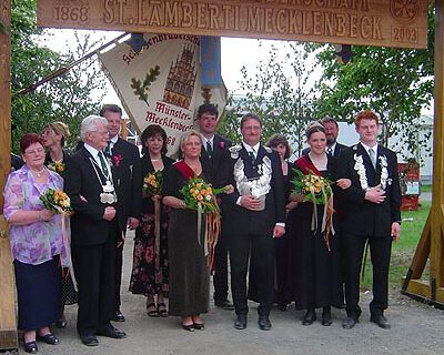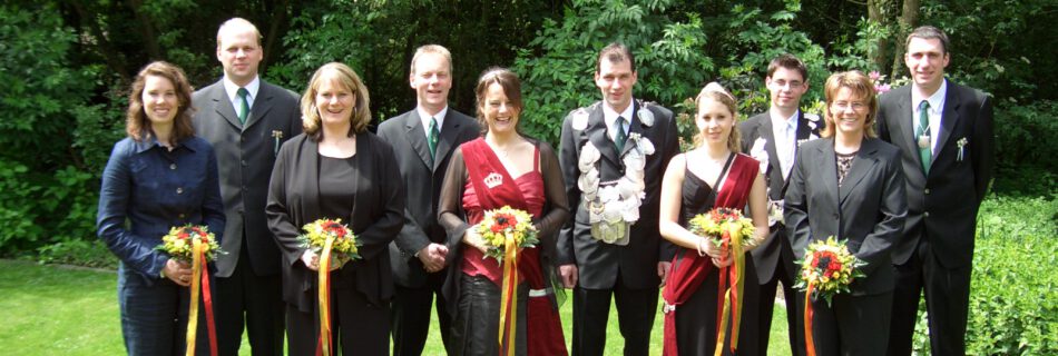 von links: Kaiserin Ursula Hoppe, Gabi Hohmann, Kaiser Josef Thier, Frank Hohmann, Prinzgemahlin Susanne Knob, Königin Antonia Brüggemann, Prinzgemahl Thomas Brüggemann, König Thomas Knob, Ingrid Knob, Prinzessin Jenny Böckmann, Klemens …