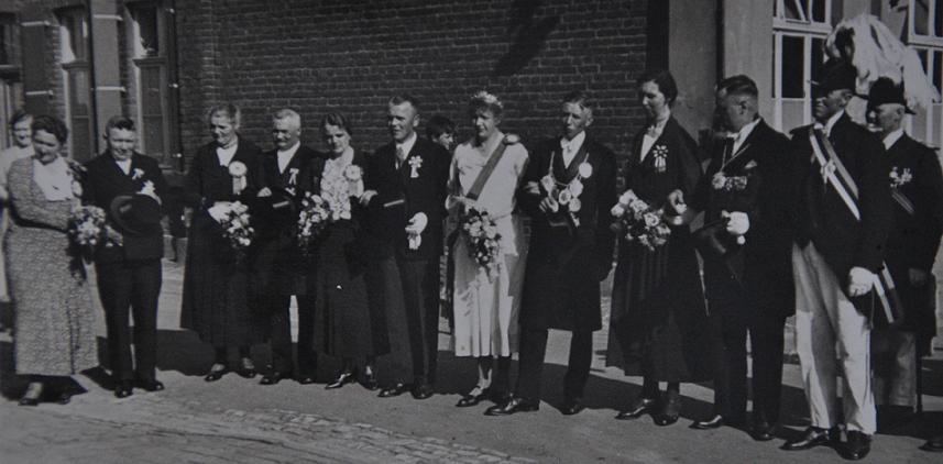 von links: Frederike und Franz Recker, Elisabeth und Herr Israel, Prinzgemahl Ferdinand Henrichmann sen., Königin Theresia Henrichmann, König Hermann Orschel, Anne Hesselmann, Josef Paulus (lt.Protokoll 17.4.2008 mit Bernhard Guddorf, Ferdinand Henrichmann u. Edmund Kröger)