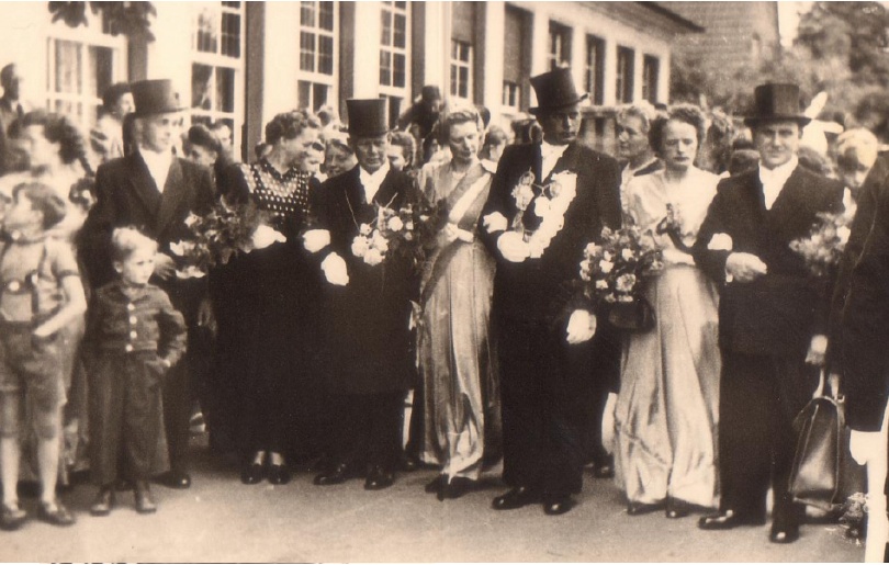 von links nach rechts: Anni Thier (Ossenkampstiege), Hubert Schöppner, Gertrud Roer (Vorjahreskönigin), Bernhard Thier sen. (Vorjahreskönig), Königin Anni Thier (Schlautstiege), König Heinz Fließ jun., Mathilde Schwering, Bernhard Buddendiek, Lucia Bischoff Everding, Willi Hesselmann
