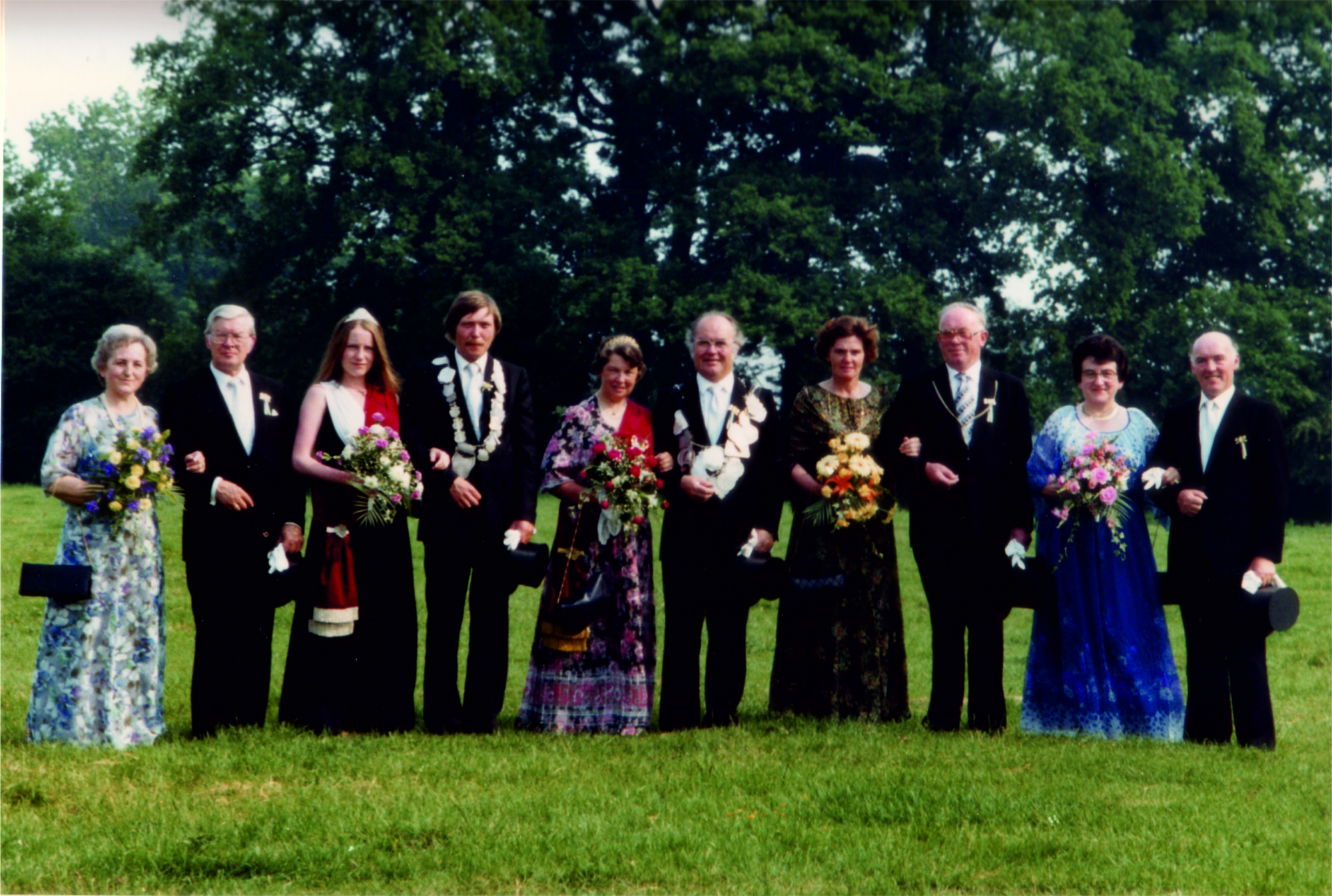von links nach rechts: Erika und Paul Müller, Prinzessin Heike Sölter, Prinz Klaus Malleis, Königin Margret Rövekamp, König Siegfried Klose, Ursula Klose, Heinrich Rövekamp, Karola und Alfons Eggert