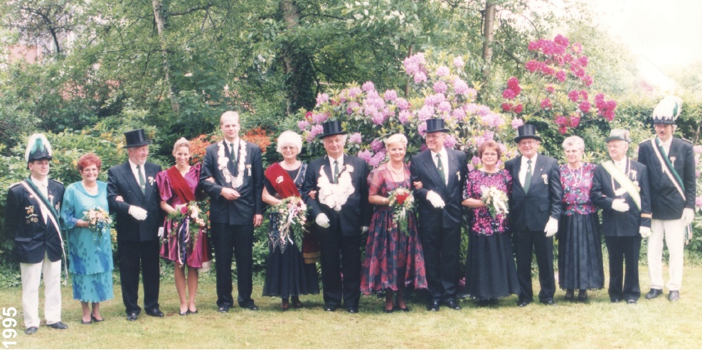 von links nach rechts: Königsoffizier Manfred Niemann, Mathilde und Heinrich Brüning, Prinzessin Korina Laagland, Prinz Christian Roer, Königin Brigitte Goldstein, König Ernst Höppener, Rita Höppener, Friedhelm Goldstein, Hannelore und Ferdi Scholthaus, Kaiserpaar Hildegund und Bernhard Thier, Königsoffizier