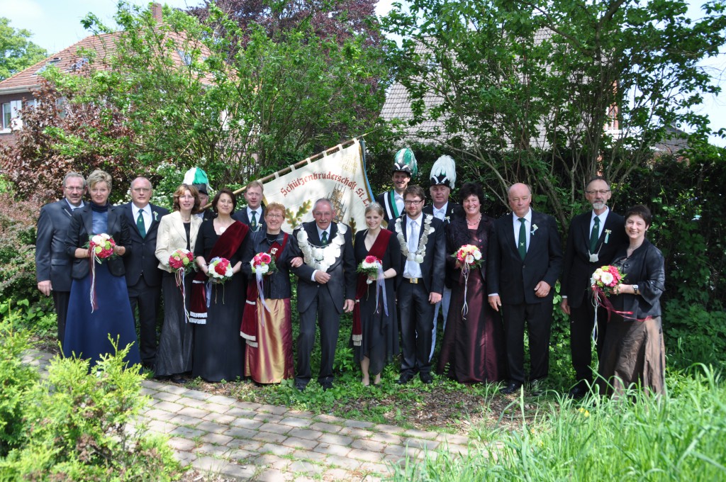von links nach rechts: Heinz und Maria Gläser, Marian und Iris Denninghaus, Fahnenoffizier, Kaiserpaar Nadia Tiehen-Sabri und Raphael Tiehen, Königin Elisabeth Merschkötter, König Klaus Mühlenkord, Prinzessin Judith Rösmann, Königsoffizier Tobias Thier,Prinz Marc Buddendieck, Königsoffizier Peter Seel, Ulla und Andreas Höppener, Manfred Merschkötter, Bärbel Mühlenkord