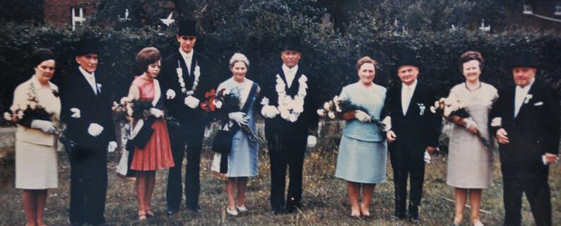 von links nach rechts: Cilly Meyer, Ludger Meyer, Prinzessin Annegret Thier, Prinz Reinhard Klosterkemper, Königin Anne Bußmann, König Bernhard Zumbusch, Elisabeth Zumbusch, Josef Bußmann, Helma Gellenbeck, Fritz Gellenbeck