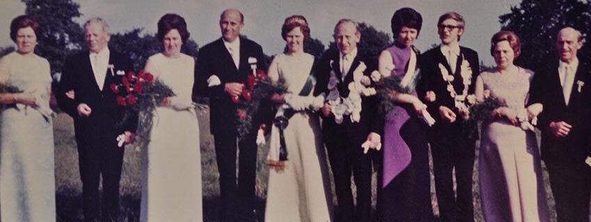 von links nach rechts: Maria Heitmann, Heinrich Thier, Hildegard Scheiper, Bernhard Leusmann, Königin Lotte Leusmann, König Bernhard Scheiper, Prinzessin Mechthild Klosterkemper, Prinz Heinz Scheiper, Änne Thier, Gerd Heitmann
