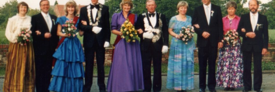 von links nach rechts: Monika und Karl-Heinz Pötter, Prinzessin Bettina Beckmann, Prinz Andreas Kötter, Königin Erika Roer, König Rudolf Schulze Isfort, Elisabeth Schulze Isfort, Helmut Roer, Gerda und Bernhard Niemann