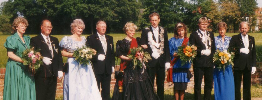 von links nach rechts: Elisabeth und Karl-Heinz Dreyer, Erika Roer, Rudolf Schulze Isfort, Königin Elisabeth Schulze Isfort, König Helmut Roer, Prinzenpaar Susanne und Thomas Knob, Gerda und Bernhard Niemann