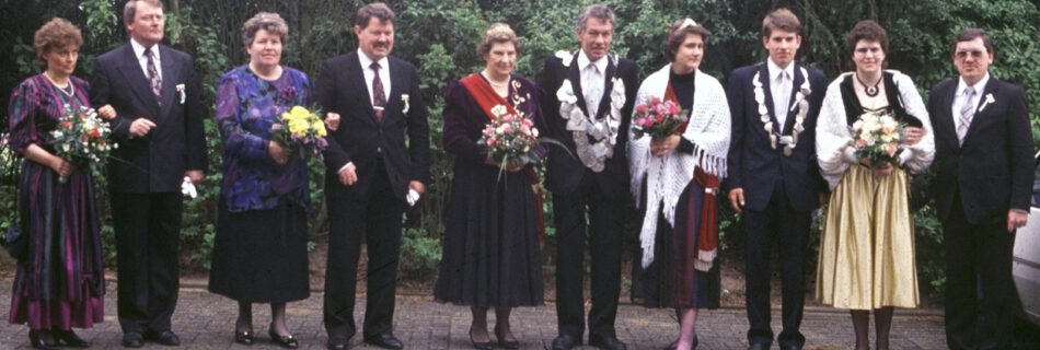 von links nach rechts: Karen und Stefan Schulze Isfort, Ruth Elberich, Tonius Konert, Königin Hedwig Konert, König Karl Elberich, Prinzessin Silke Buddendiek, Prinz Christian Elberich, Petra und Lothar Scholthaus