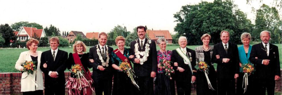von links nach rechts: Elisabeth und Rudi Kortwinkel, Prinzessin Kathrin Birk, Prinz Frank Buddendiek, Königin Agnes Orschel, König Reinhard Klosterkemper, Kaiserpaar Hildegund und Bernhard Thier, Maria Klosterkemper, Hermann Orschel, Gerda …