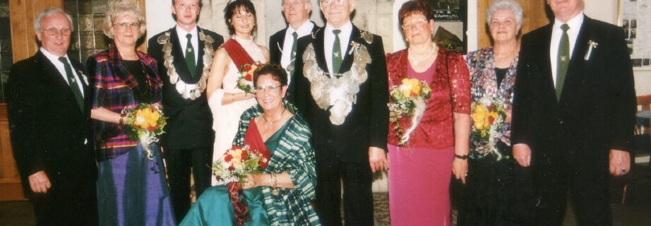 von links nach rechts: Egon und Marianne Tepe, Prinz Raphael Tiehen, Prinzessin Nadia Sabri, Königin Anne Endres, Willi Roer, König Josef Thier, Ursula Hoppe, Mimi Roer, Dieter Endres
